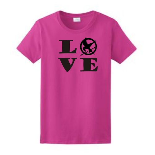 | This review is from: THE HUNGER GAMES 2012 "LOVE" MOCKINGJAY DISTRICT 12 LADIES Short Sleeve T-shirt I love the shirt and it fits very well. The arms were a little tight for me, but okay. Super fast shipping. I got the shirt in the Heliconia color. |